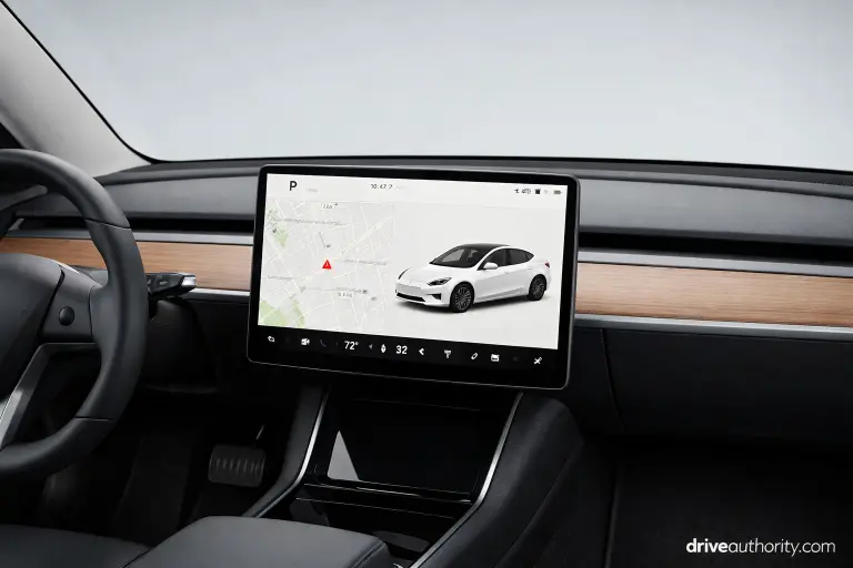 - Interior: Minimalist, 15″ center touchscreen controls everything