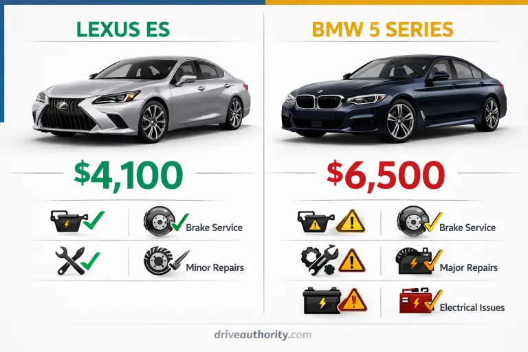 BMW ownership costs climb quickly after the warranty expires. Specifically, scheduled maintenance alone averages $6,500 over five years—double a comparable Lexus. Furthermore, unscheduled repairs add significantly more. Therefore, a typical 5 Series requires approximately $4,000 in repairs between years four and six, compared to under $1,500 for a Lexus ES.